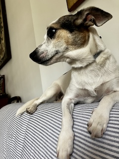 Baguette, la cagnolina di famiglia. È una meticcia di Jack Russell Terrier. Caratteristica: grandissime orecchie. Noi le chiamiamo "pale eoliche".Baguette, la meticcia di Jack Russell (le orecchie tipo “pala eolica” le derivano -pare- da un antenato Pinscher…) con cui vivo e sopravvivo, indossa un impermeabile (rosa, ça va sans dire) quando piove e un piumino imbottito quando fa freddo. Ok, il freddo di Roma è relativo, rispetto a quello che “vive” una mia amica che ieri mi ha scritto «Qui -15°. Da te?». Però, la piccola è freddolosa. E gradisce avere torace e pancino al caldo.