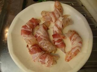 Prendete la pancetta e avvolgete i gamberi.