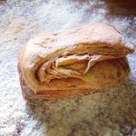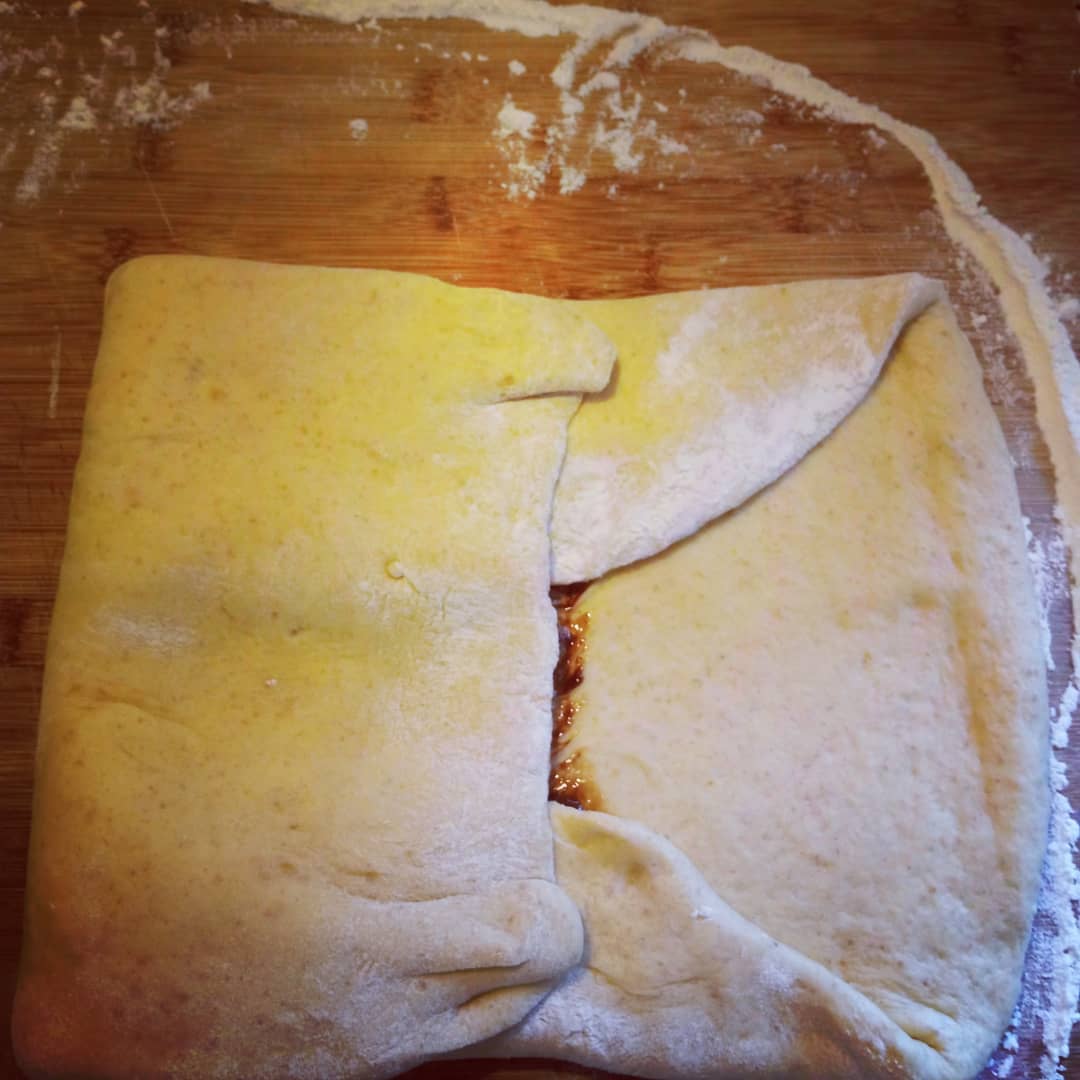 Prendete l’impasto, stendetelo fino a ottenere un bel lenzuolo, poi al centro mettete il foglio di burro. Chiudete a portafoglio (come nella foto), rigirate e stendete, poi richiudete a portafoglio e mettete in frigo. Dovrete stendere e richiudere così per altre tre volte a intervalli di 40 minuti circa, ma davvero: ci vuole più a dillo che a farlo. Ho guardato un drama, ho lavorato…