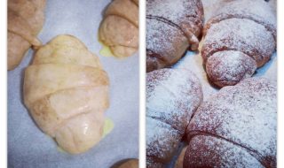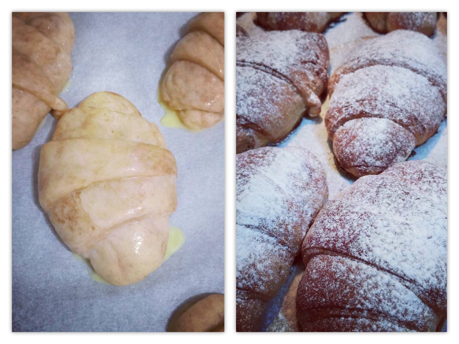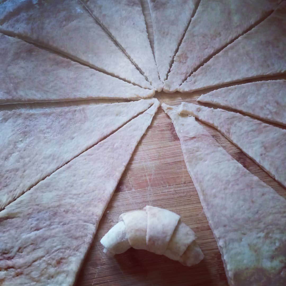 Stendete un bel cerchio e poi ricavatene tanti triangoli quanti volete: più sottile è l’impasto, più cornetti avrete. Per formarli dovete solo arrotolare il triangolo dalla base alla punta.