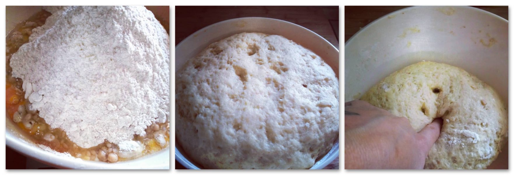 Mettete a lievitare: vi serviranno un paio di ore. Sgonfiate e rimpastate, e aspettate un’altra mezz’ora.