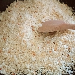 Una volta macinato il pane, si deve fare in modo che l’umidità ancora residua si dissipi del tutto, quindi procedere a tostarlo un po’. Si può fare in forno già caldo per qualche minuto, diciamo quattro, oppure in padella (per cinque, sei minuti), avendo però cura di girare sempre con una cucchiarella in modo che non bruci.