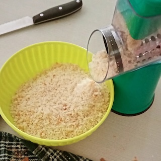 Tagliare a pezzi o a fette e mettere in un frullatore o, come nel mio caso, un taglia verdure. Ho infatti scoperto che l’attrezzo che uso per tagliare le zucchine a julienne è ottimo per macinare il pane della dimensione che preferisco (ma sì, è a mano e richiede cinque minuti in più… Tiè, dieci). Macinare a mano il pane però permette di sentire un profumo buonissimo (se il pane poi è fatto in casa, ancora meglio!).